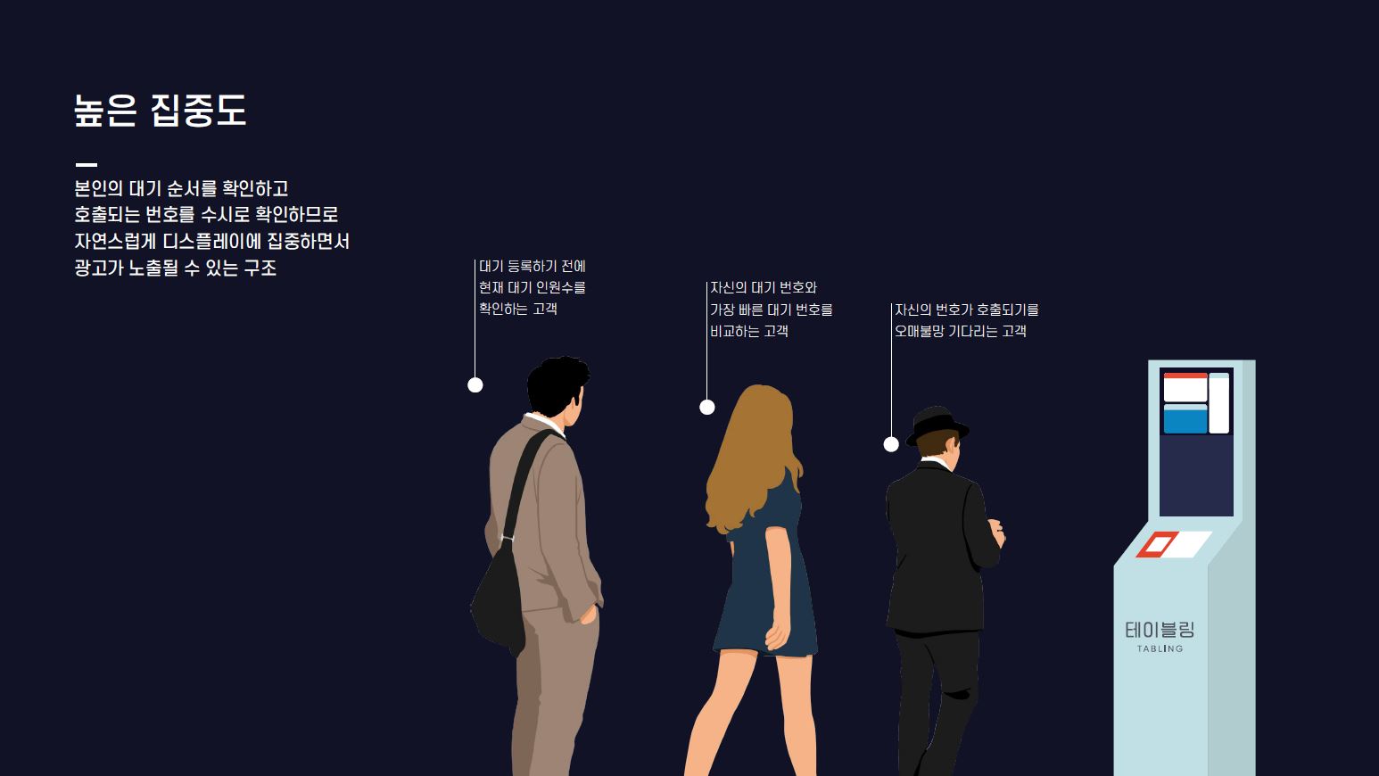 타 매체에 비해 테이블링 웨이팅광고는 대기 등록하기 전에 현재 대기 인원수를 확인하는 고객 / 본인의 대기 순서와 가장 빠른 대기 번호를 비교하는 고객 / 자신의 번호가 호출되기를 오매불망 기다리는 고객을 대상으로 자연스럽게 키오스크를 보며 집중하게 되면서 집중도가 높아지고 반복적으로 광고가 노출될 수 있는 구조를 가지고 있습니다.