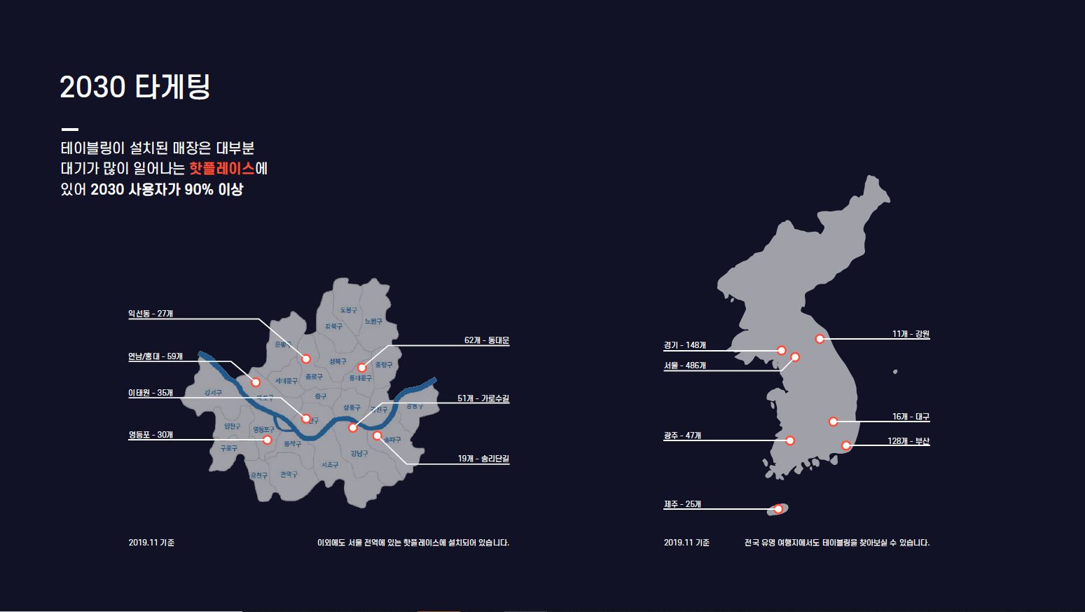 테이블링이 설치된 매장은 대부분 전국에서 대기가 많이 일어나는 핫플레이스와 유명한 여행지에서 인기 많은 맛집에 있어 대기하는 고객의 90% 이상이 2030입니다.