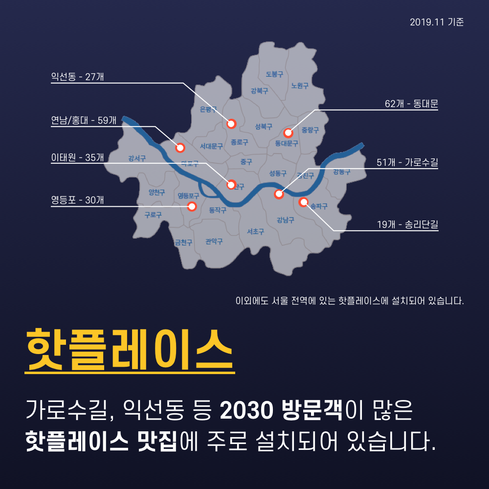 가로수길, 익선동, 이태원, 홍대 등 2030 방문객이 많은 핫플레이스 맛집에 주로 설치되어 있습니다.