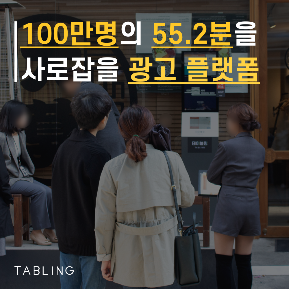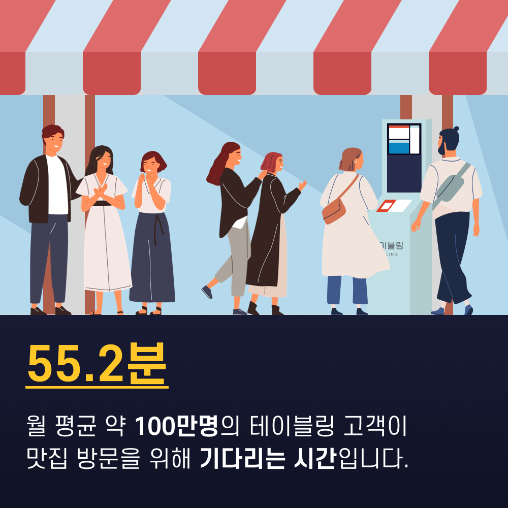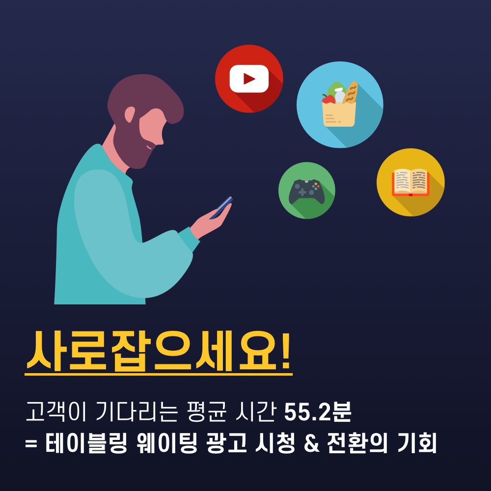고객이 기다리는 평균 시간 55.2분! = 테이블링 웨이팅 광고시청 & 전환의 기회가 될 수 있는 시간입니다.