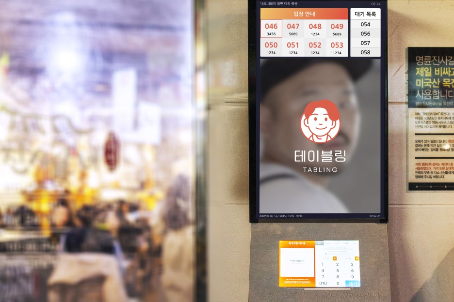 테이블링은 맛집 매장 앞 대기 키오스크에 직접 대기를 입력하는 시스템입니다. 손님들은 키오스크 태블릿을 통해 대기 명단을 접수하면서 본인의 대기 순서를 확인하는 과정에서 키오스크 디스플레이에 송출되는 광고를 접하게 됩니다.