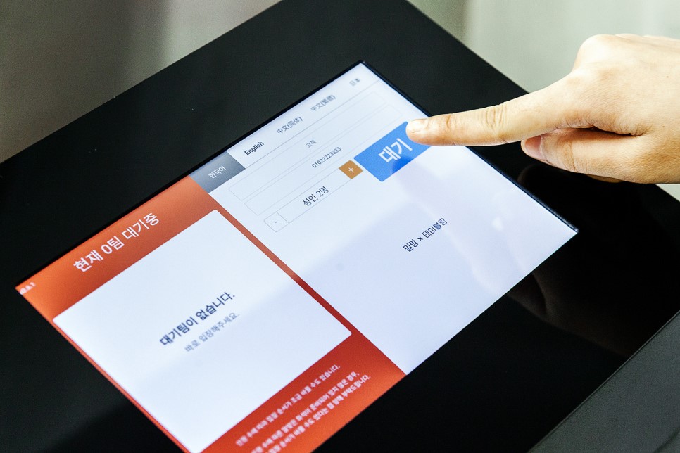 고객이 직접 입력하는 대기 키오스크로 일일이 응대할 필요 없이 터치 한 번으로 고객을 호출할 수 있으니