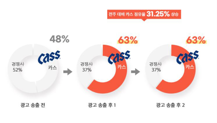 광고 미송출 기간 대비 광고 송출 후 23개 판매량 증가 / 전주 대비 카스 점유율 31.25% 상승