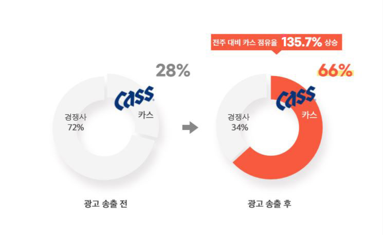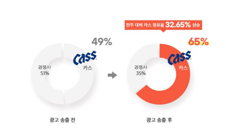 광고 미송출 기간 대비 광고 송출 후 67개 판매량 증가 / 전주 대비 카스 점유율 135.7% 상승