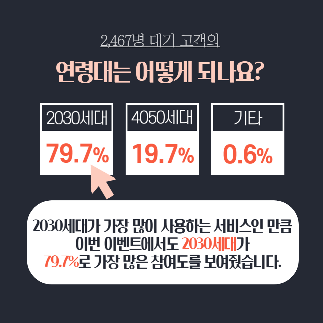 테이블링 웨이팅 시스템은 2030 세대가 가장 많이 사용하는 서비스인 만큼 이번 이벤트에서도 2030세대가 79.7%로 가장 많은 참여도를 보여줬습니다. 4050세대는 19.7%, 60대 이상은 0.6% 참여해주셨습니다.