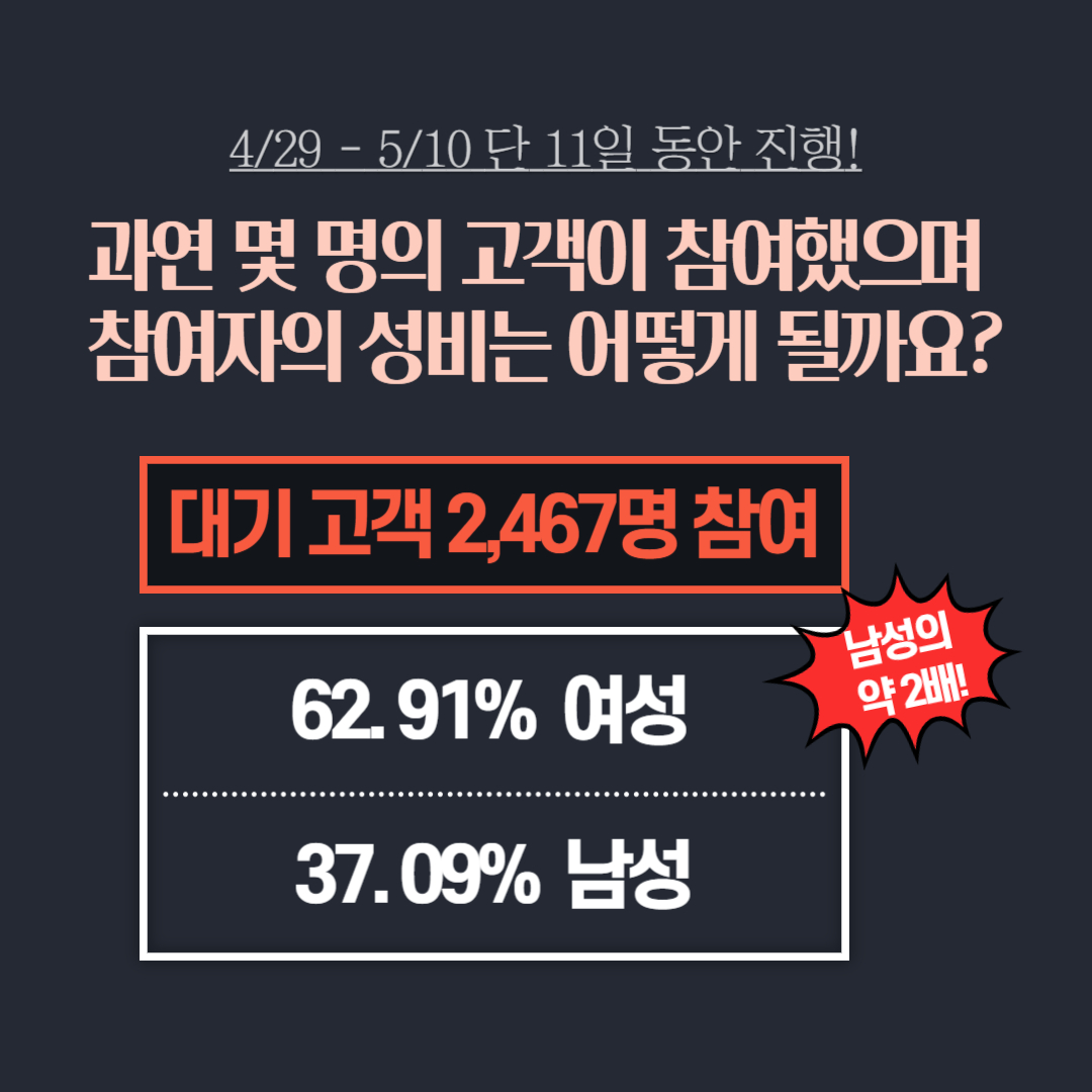 단 11일 동안 진행한 참여형 이벤트 결과를 보시면 웨이팅광고는 2030 여성을 타겟으로 광고 송출이 가능하며, 얼마나 큰 효과를 볼 수 있다는 것을 알 수 있습니다.
